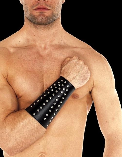Echt tuiglederen armkap versiert met metalen nieten. Verstelbaar in 3 maten met drukknopen.
