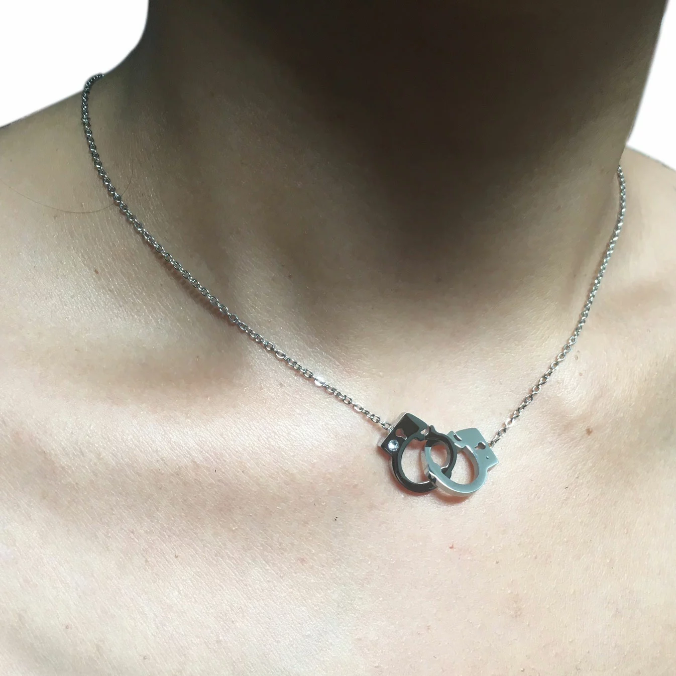 Toon subtiel uw kinky dubbelleven met deze schattige, stijlvolle halsketting. Aan dit speelse fetisj accessoire prijken twee, verbonden handboeien met een siersteentje om te hinten naar uw ontdeugende geheimen. Deze halsketting heeft een haaksluiting aan de achterzijde en heeft een verstelbare omtrek van 45cm – 49cm.