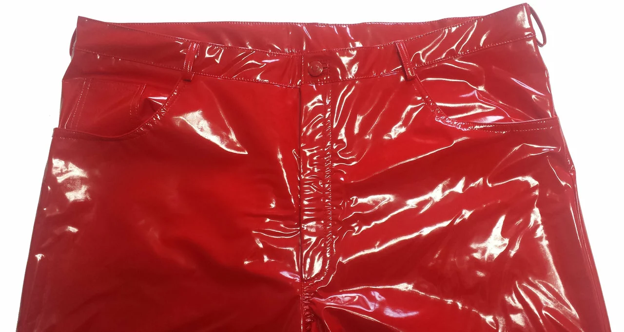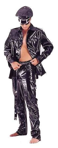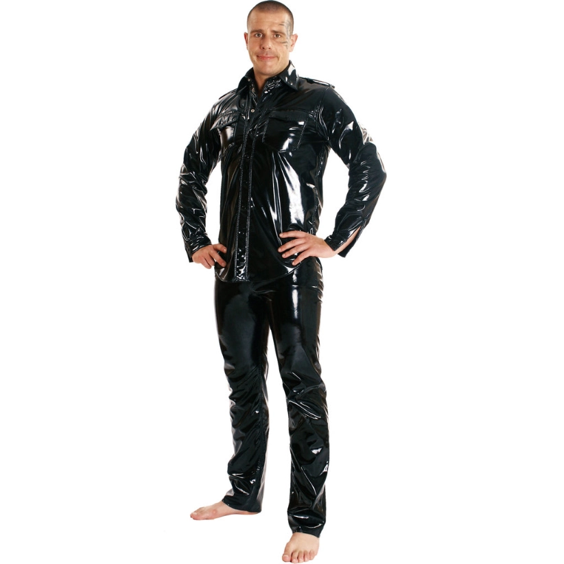 Glanzende zwarte lakjeans voor heren met riemlussen en zakken aan de zij- en achterkant. De ideale broek om iedere man z’n fetisj outfit compleet te maken!