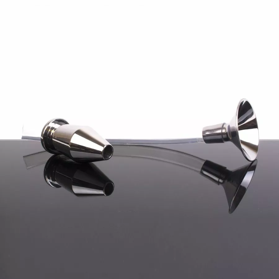 Sometimes, with enema play, the visual is just as intense as the sensations. This setup provides a hollow steel anal plug, flexible (clear) tubing, and a metal funnel. With this you can fill your partner, easily, with your favorite choice of liquid. Command them to hold it in, once you’ve removed the plug or simply remove the hose to let the liquid expel on its own. The steel can even heat or cool (depending on the liquid used) for sensational temperature play.