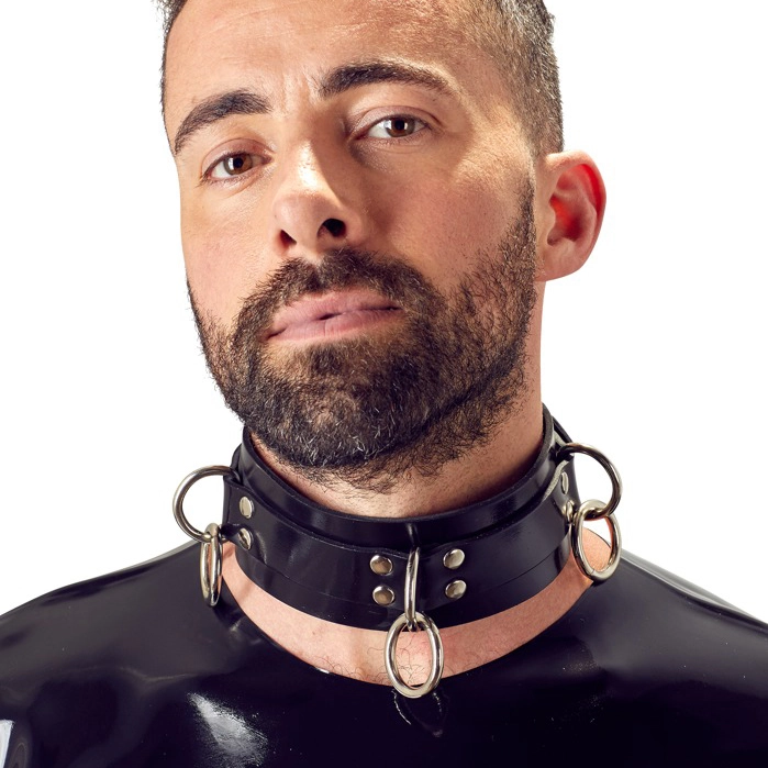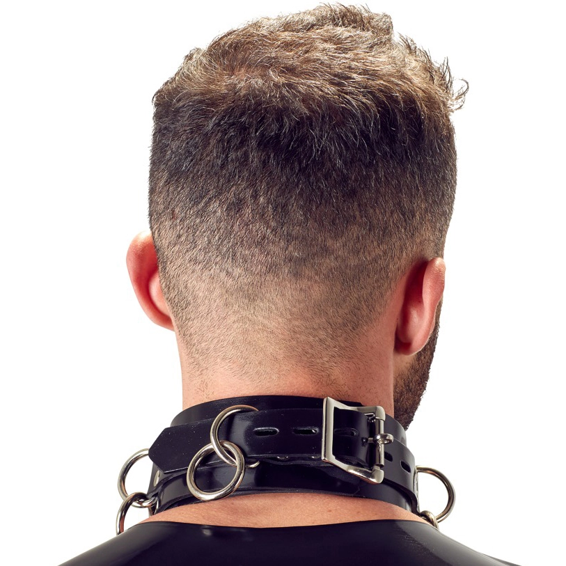 Hét perfecte dark room accessoire voor bondage sessies: Zwarte 5cm brede volledig latex halsband met 4 robuuste stalen dubbele ringen. Met verstelbare en afsluitbare gesp.