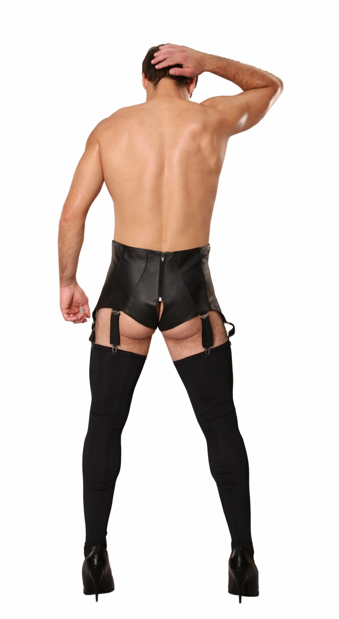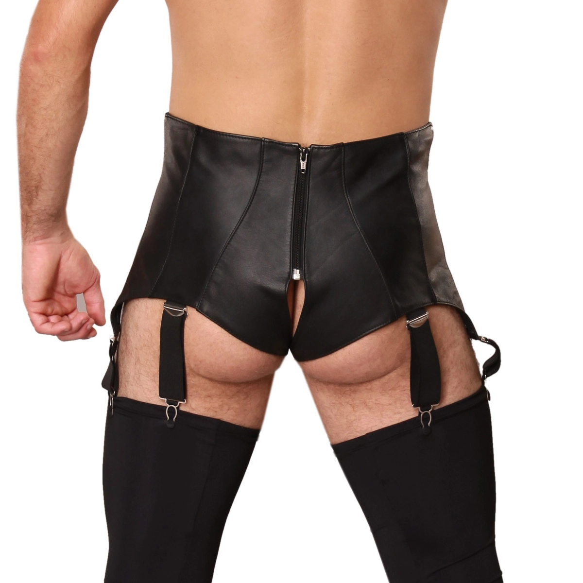 Hoge kwaliteit lederen tailleslip voor heren met rijgveters aan de voorzijde, opening aan de achterkant en 3 brede jarretels aan beide kanten. Een uniek fetisj kledingstuk dat ook nog eens gemakkelijk aan te trekken is dankzij de rits aan de achterzijde en met de veters naar perfectie geregen kan worden.