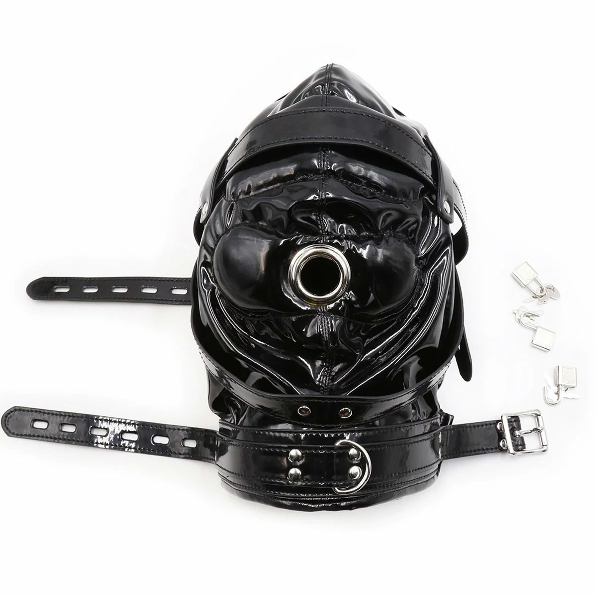 Grit your teeth and bear it boy! This is not for those that panic or anyone who has a fear of the dark. When the 3 locking PVC straps are pulled tight against the padded eyes, mouth and ear areas you get that oh boy feeling. With your senses leaving quickly you become very submissive to your master’s demands and struggle to hear their every word. Comes in one size with laces for adjusting to fit.