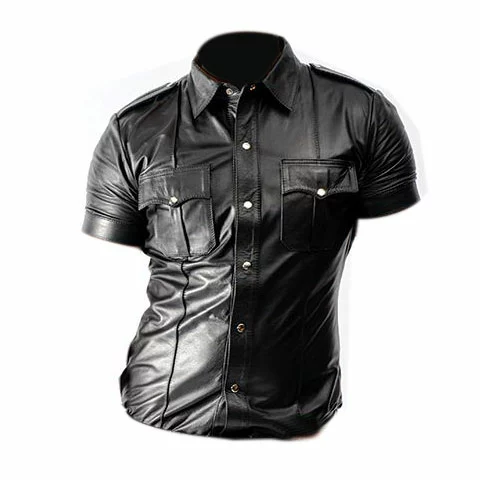 Gemaakt van het zachtste leer dat op de markt verkrijgbaar is en handgemaakt in onze leerwerkplaats van zacht schapenleer dat meer rekbaar is. Deze shirts zijn getailleerd zodat ze mooi de contouren van je bovenlichaam volgen, aangezien een sexy look niet goed te combineren is met baggy shirts. Onze lederen politie shirts hebben korte mouwen, epauletten en twee borstzakken.