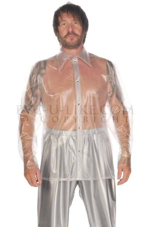 Beleef het heerlijke gevoel van het gladde PVC op je huid. Mannen shirt met gestikte kraag en drukknopen. Ziet er goed uit en kan gedragen worden over PVC Jeans of korte broek. lengte 76 cm.