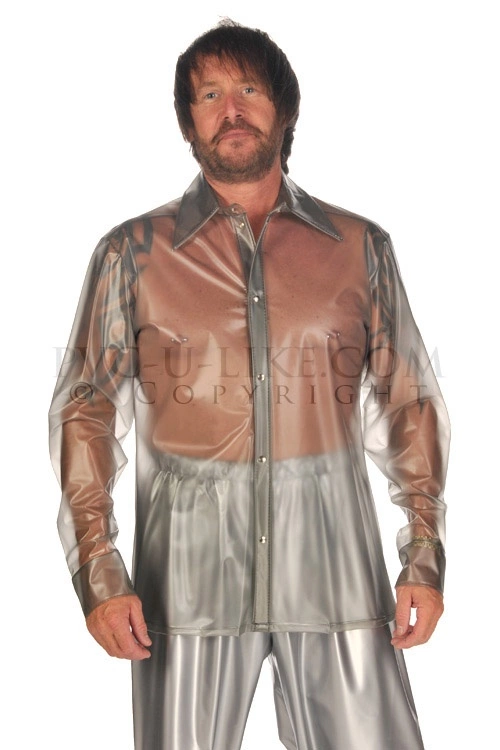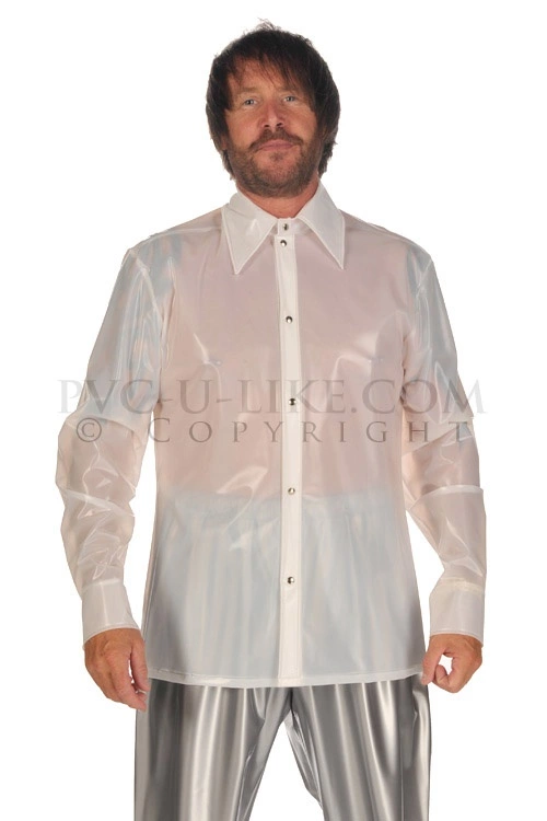 Beleef het heerlijke gevoel van het gladde PVC op je huid. Mannen shirt met gestikte kraag en drukknopen. Ziet er goed uit en kan gedragen worden over PVC Jeans of korte broek. lengte 76 cm.