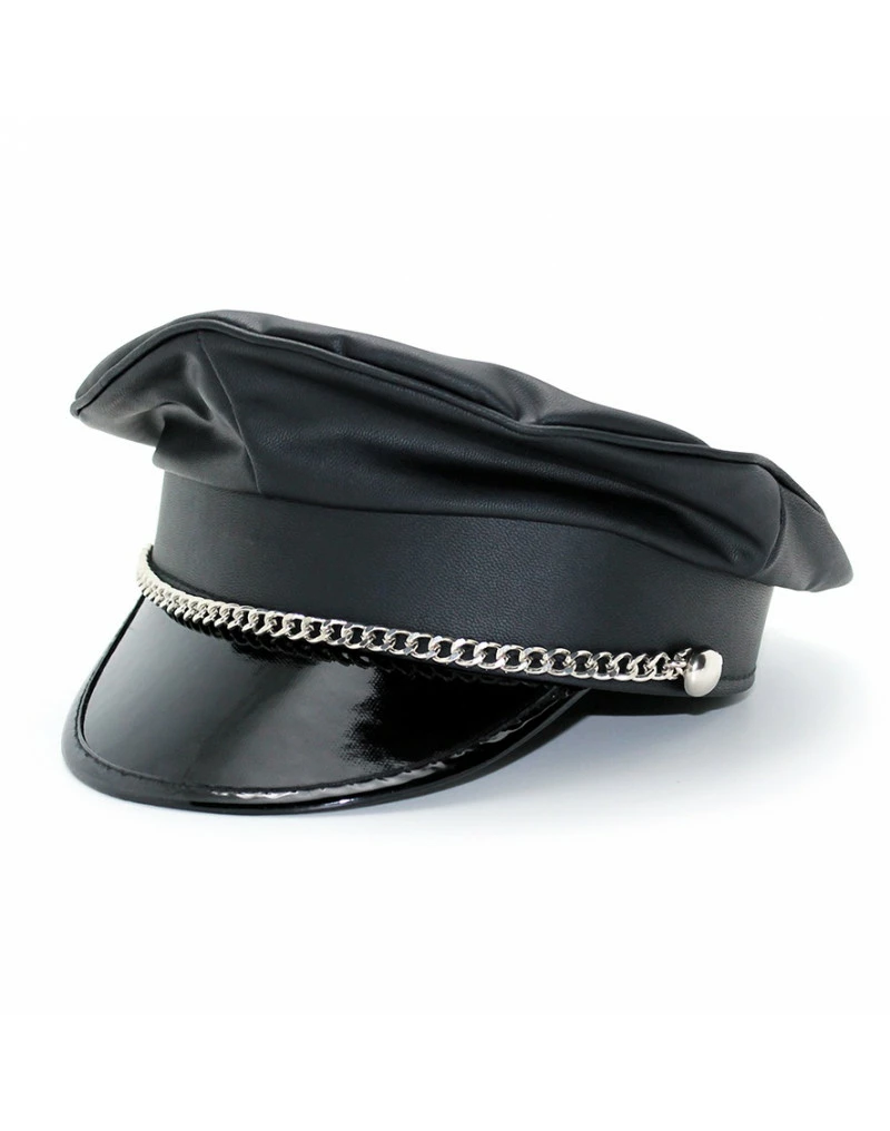 This great fetish Police cap completes your kinky outfit. As you can see on the pics: The front is made of a very shiny vinyl. The inside of the cap is lined. Chain on the front, fetish look.