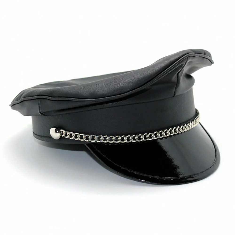 This great fetish Police cap completes your kinky outfit. As you can see on the pics: The front is made of a very shiny vinyl. The inside of the cap is lined. Chain on the front, fetish look.