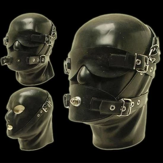 Zwart, Clinic red (oranje) of semie-transparant Latex disciplinemasker van Studio Gum.