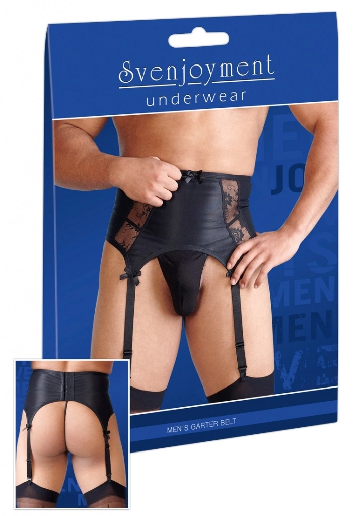 Brede, zwarte jarretelgordel gemaakt van kant en elastisch materiaal. Met vier bandjes. Haak-sluiting aan de achterkant. 90% polyamide, 10% elastaan.
