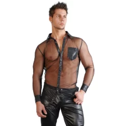 Een shirt met een kraag, lange mouwen, een rij van drukknopen aan de voorkant en een borstzak. Transparant zwart. 100% polyamide.