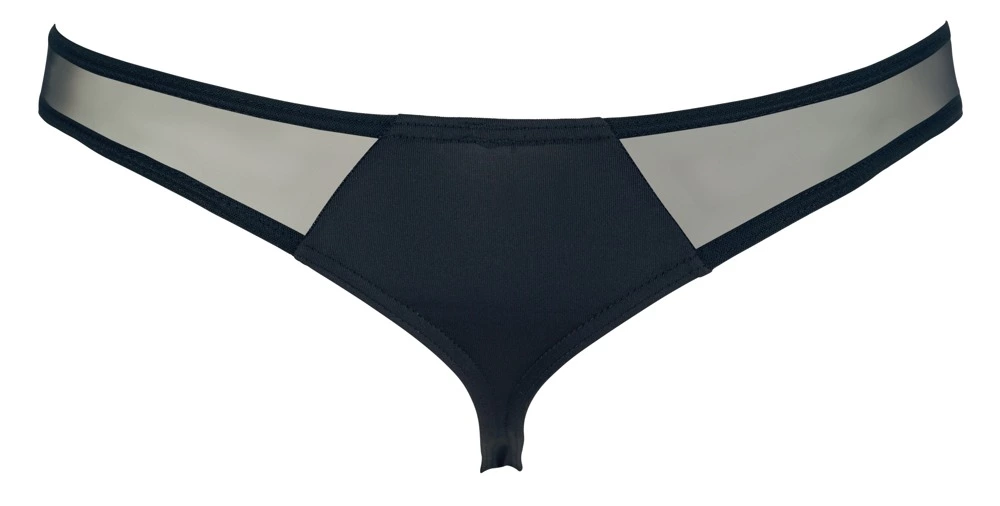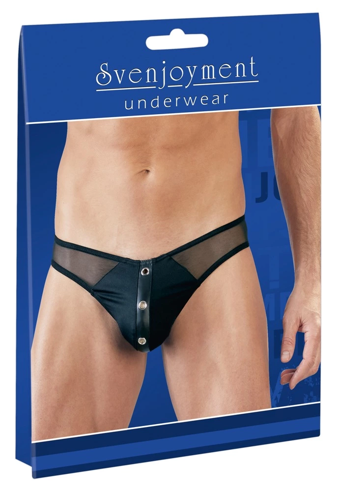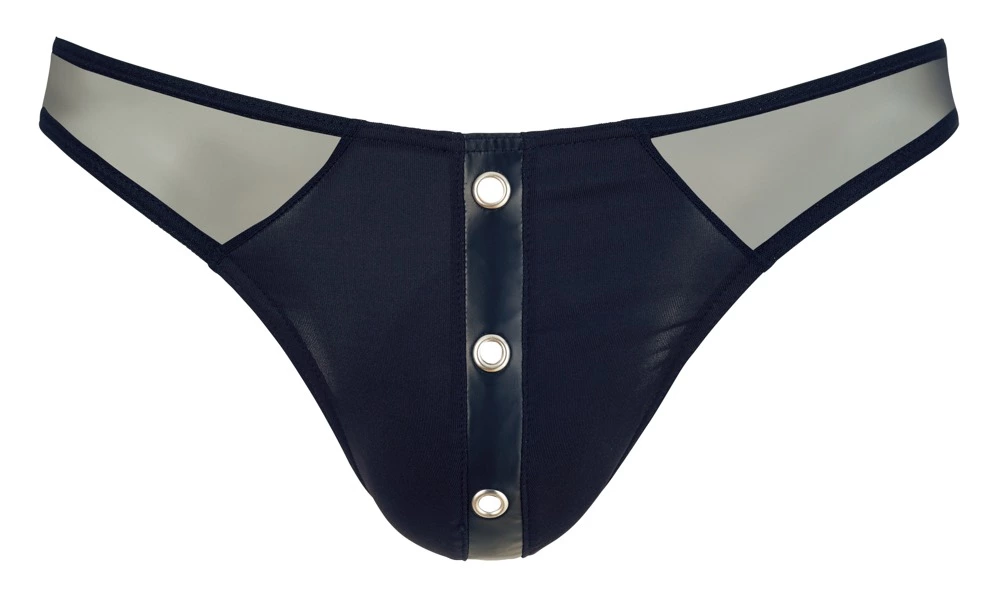 Heren string gemaakt van powernet met centrische microvezel inzetstukken aan de voor- en achterkant. Met decoratieve oogjes aan de voorkant.