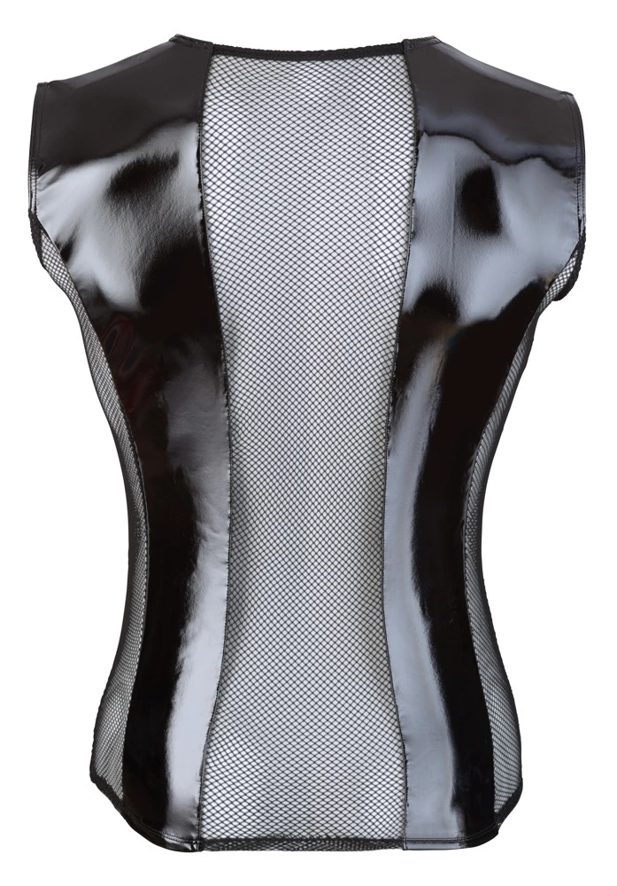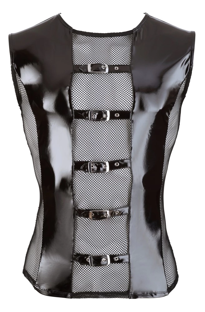 Shiny shirt made out of bi-elastic vinyl with stretchy net inserts at the front and the back. It is comfortable to wear and has 5 stylish straps at the front with buckles.