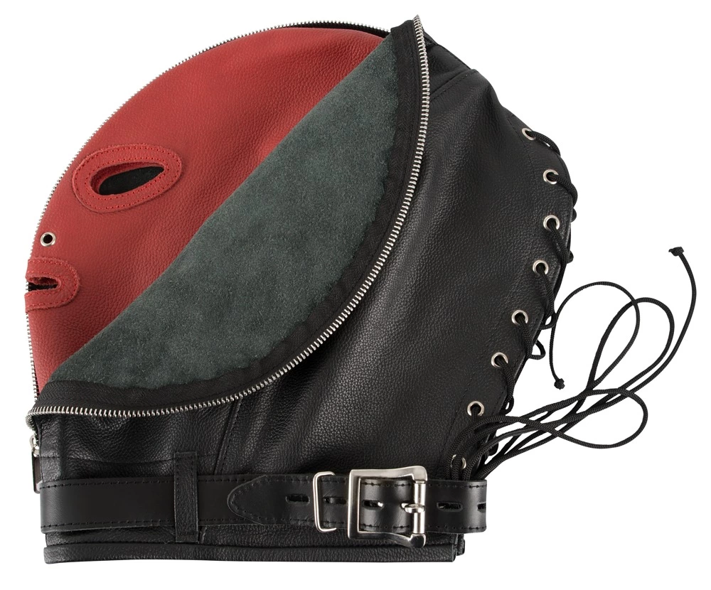 Dubbellaagse lederen hood met rits over de gehele voorkant zodat je het vuurrode lederen gezichtsmasker eronder gemakkelijk kunt onthullen of verstoppen. Het masker kan geheel naar comfort worden versteld dankzij de vetersluiting aan de achterzijde (met beschermings flap) en de lederen riem rondom de hals.