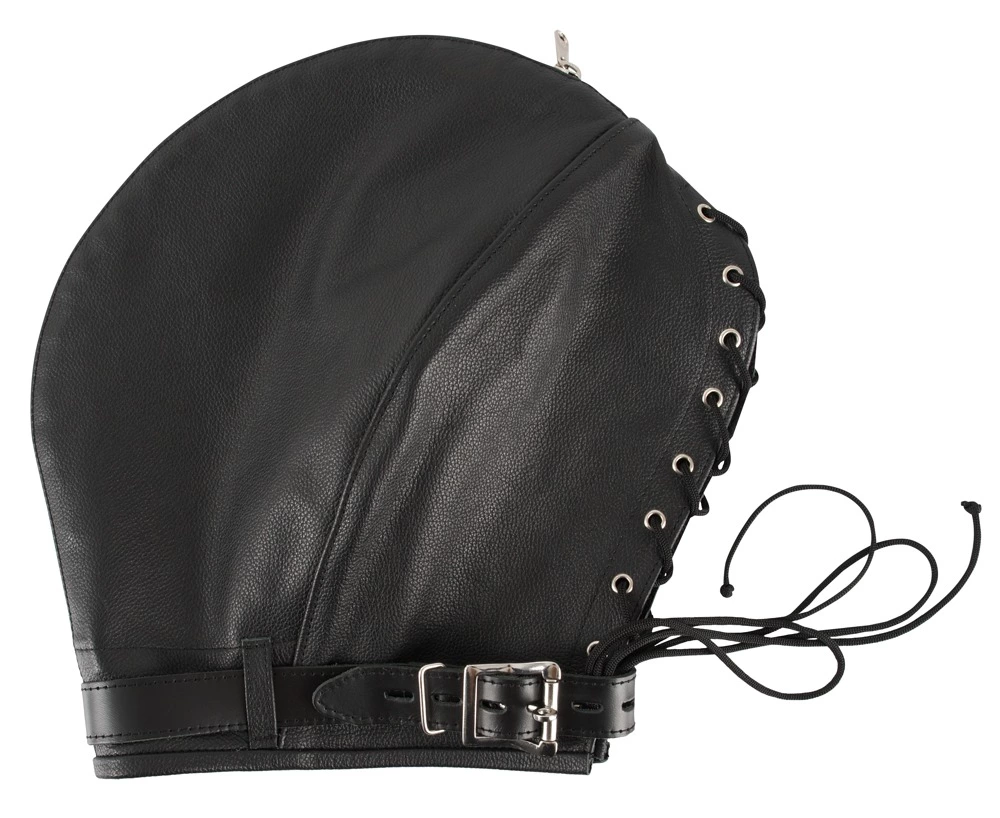 Dubbellaagse lederen hood met rits over de gehele voorkant zodat je het vuurrode lederen gezichtsmasker eronder gemakkelijk kunt onthullen of verstoppen. Het masker kan geheel naar comfort worden versteld dankzij de vetersluiting aan de achterzijde (met beschermings flap) en de lederen riem rondom de hals.