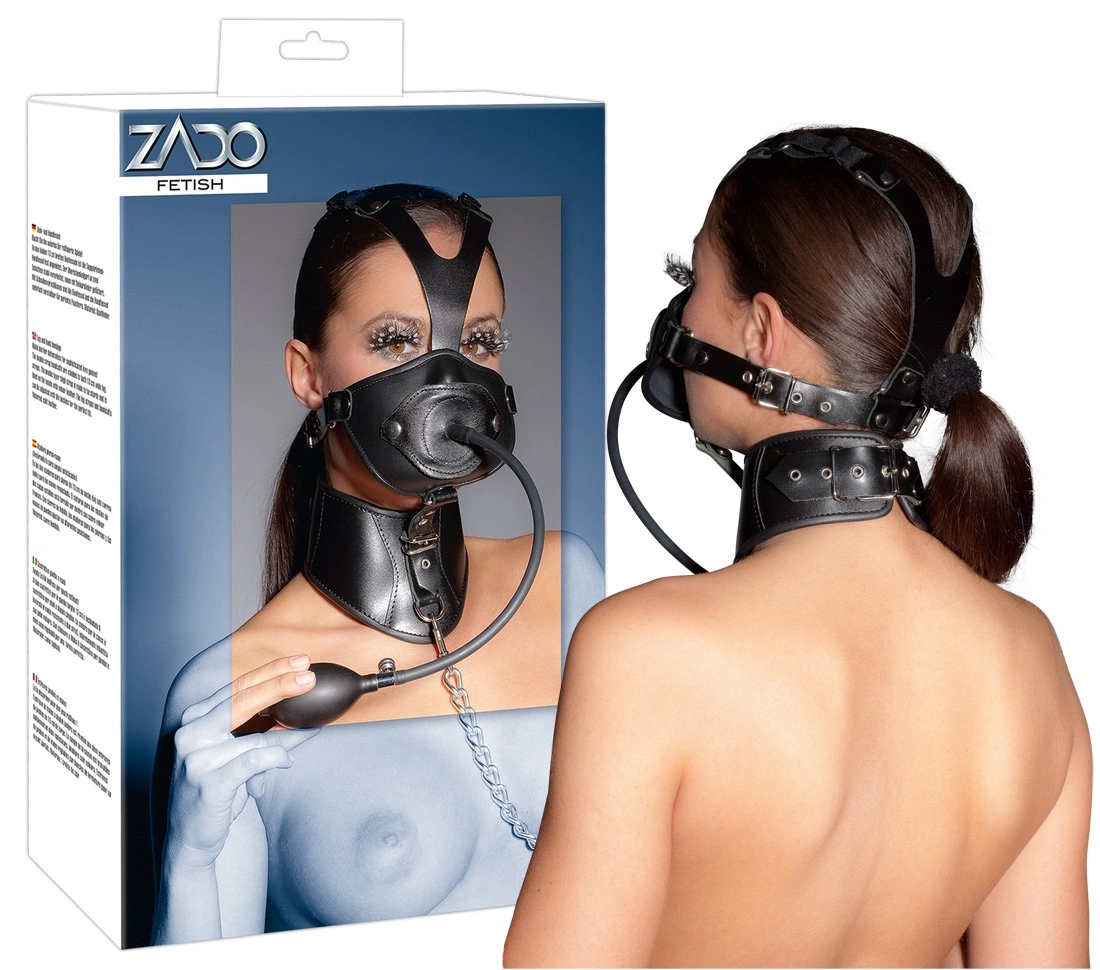 Gecombineerde, multi-verstelbare hoofd en nek harnas met afneembare riem en opblaasbare latex gag in de vorm van een penis. Breedte bondage collar 38 cm, lengte riem ca. 59 cm. Zwart leder.